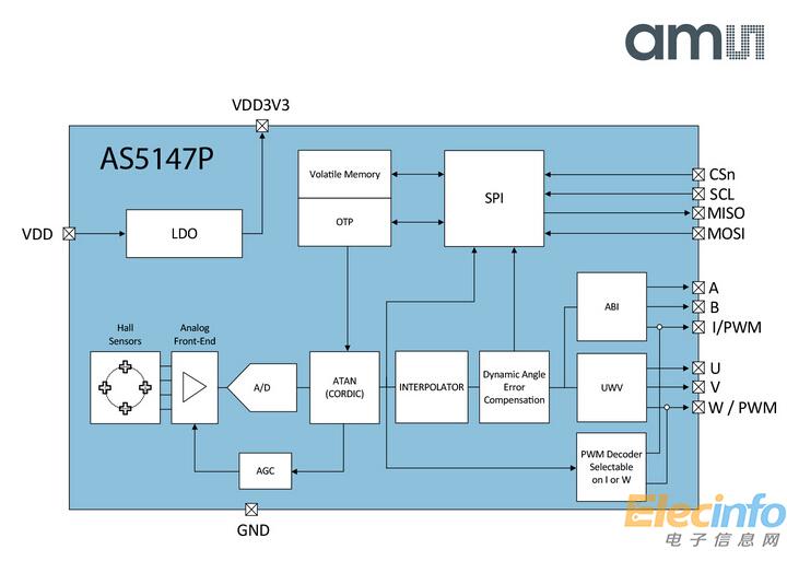 AS5147P在轉(zhuǎn)速最高達28000rpm的情況下仍能提供精確的絕對和增量測量輸出,特別適用于對安全有較高要求的應用,如電動轉(zhuǎn)向(EPS)、剎車和油門的踏板、泵、雙離合變速箱、起動電機、交流發(fā)電機以及雨刮器電機。