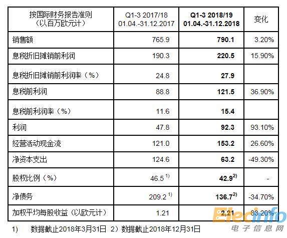 累計銷售額從7.659億歐元增至7.901億歐元,增漲3.2%。半導(dǎo)體封裝載板事業(yè)部與醫(yī)療健康板塊的銷售增長,部分抵消了移動設(shè)備、汽車和工業(yè)電子板塊在第三季度因需求下降所帶來的負面影響。受匯率影響,特別是美元疲軟,銷售額受到負面影響。而新會計準則(IFRS15)的實施對其產(chǎn)生了積極影響。