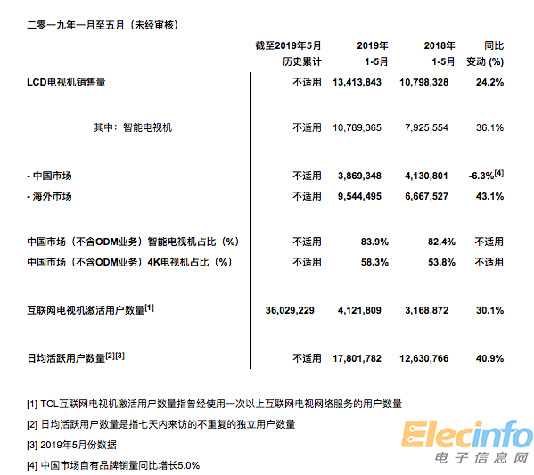TCL2019年一至五月電視機(jī)銷售量達(dá)1,341萬(wàn)臺(tái)