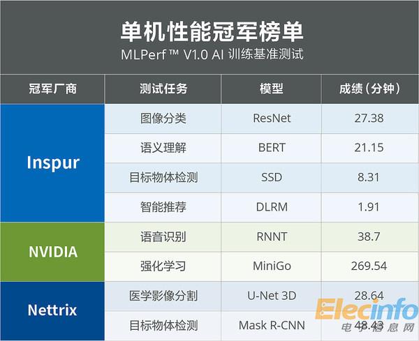 北京2021年7月2日 /美通社/ --美國(guó)東部時(shí)間6月30日,國(guó)際權(quán)威AI基準(zhǔn)測(cè)試MLPerf?公布最新一期榜單。在集群封閉任務(wù)賽道中,谷歌與NVIDIA各自獲得4項(xiàng)第一;在單機(jī)封閉任務(wù)賽道中,浪潮獲全部8項(xiàng)訓(xùn)練任務(wù)的4項(xiàng)冠軍,NVIDIA、Nettrix各獲得2項(xiàng)任務(wù)冠軍。